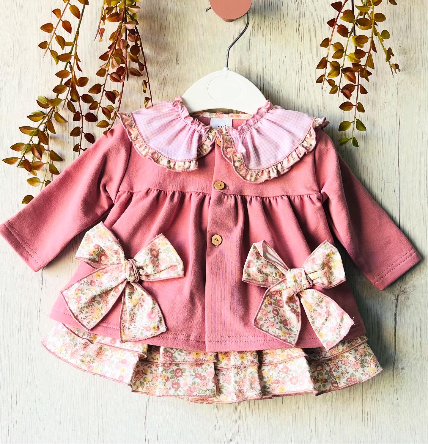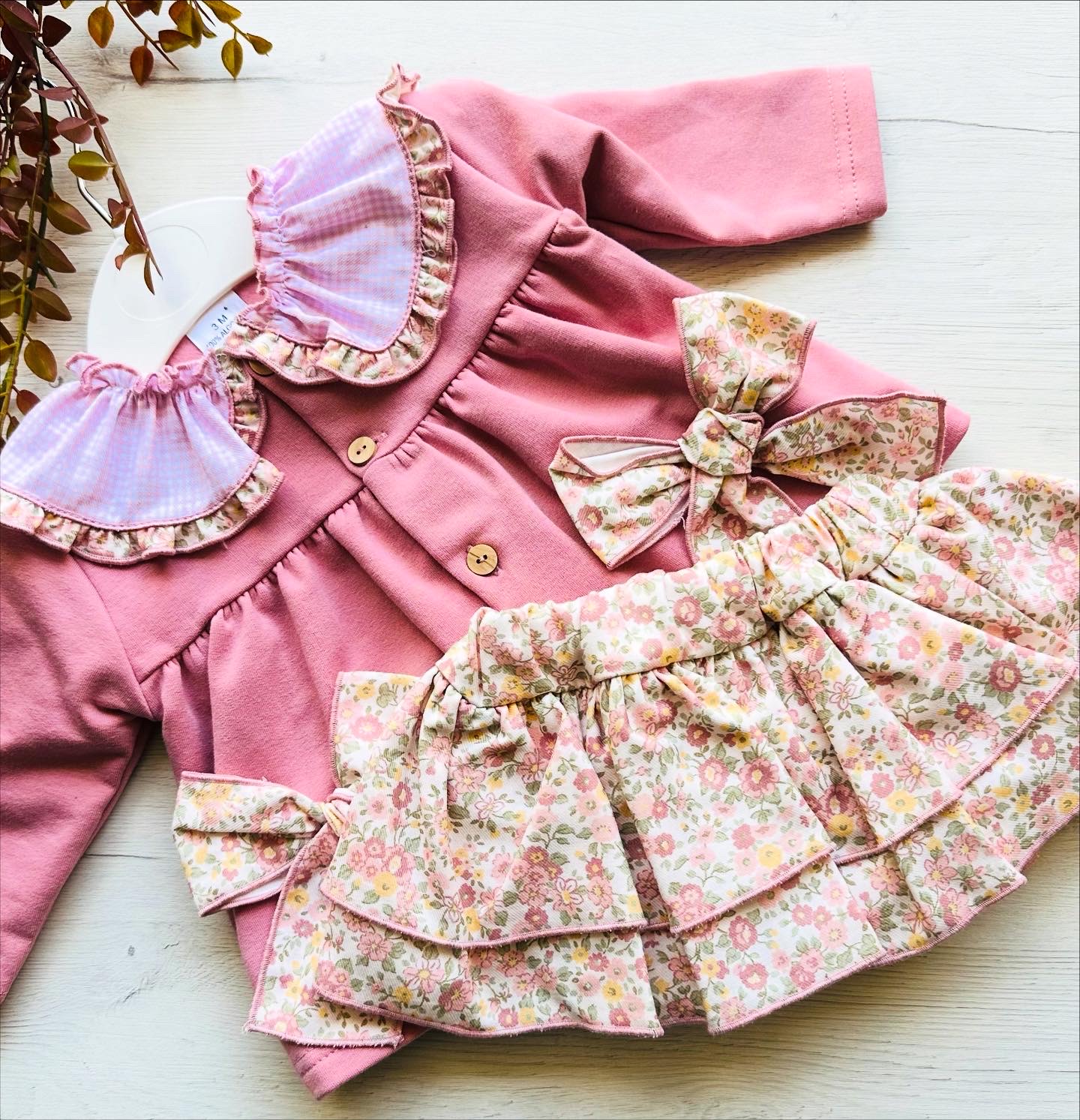 Conjunto dos piezas formado por blusa de felpa y ranita con volantes.