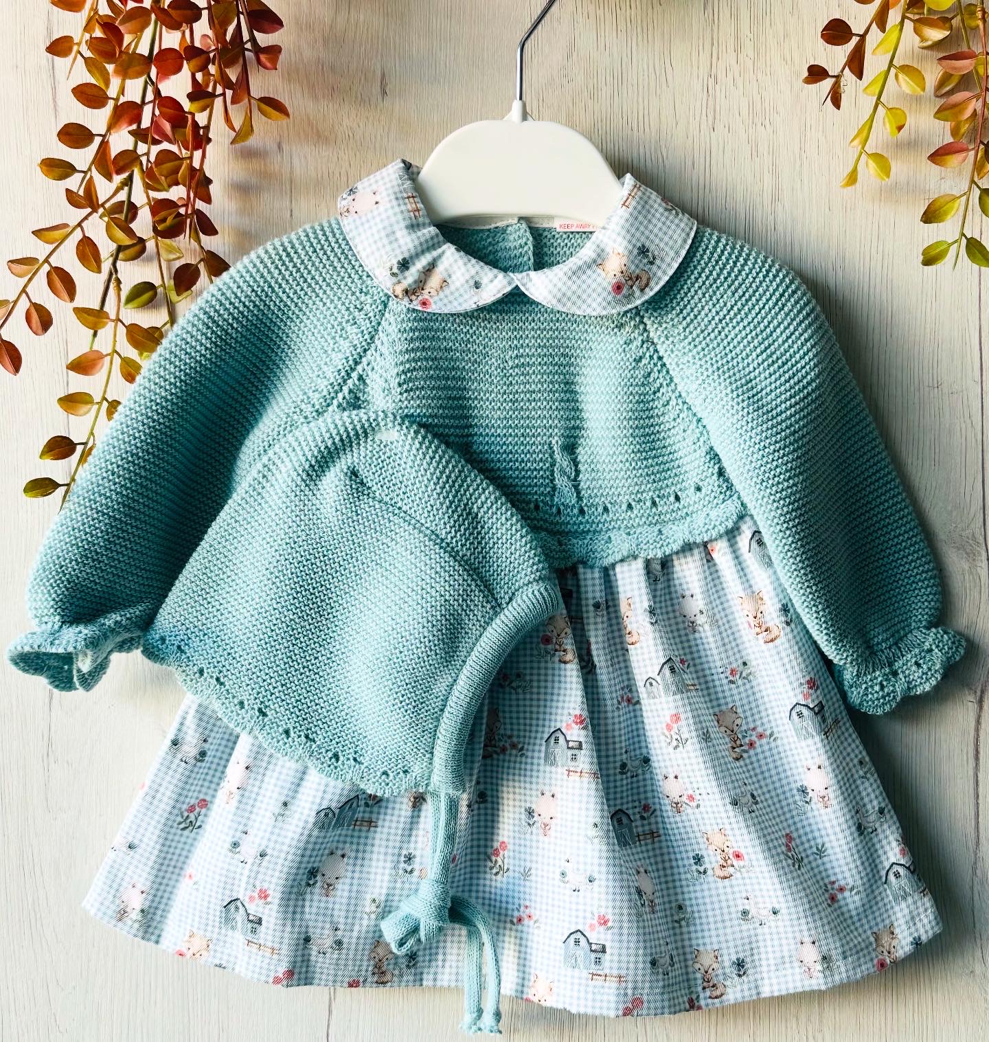 Conjunto de punto turquesa dos piezas (vestido y capota),