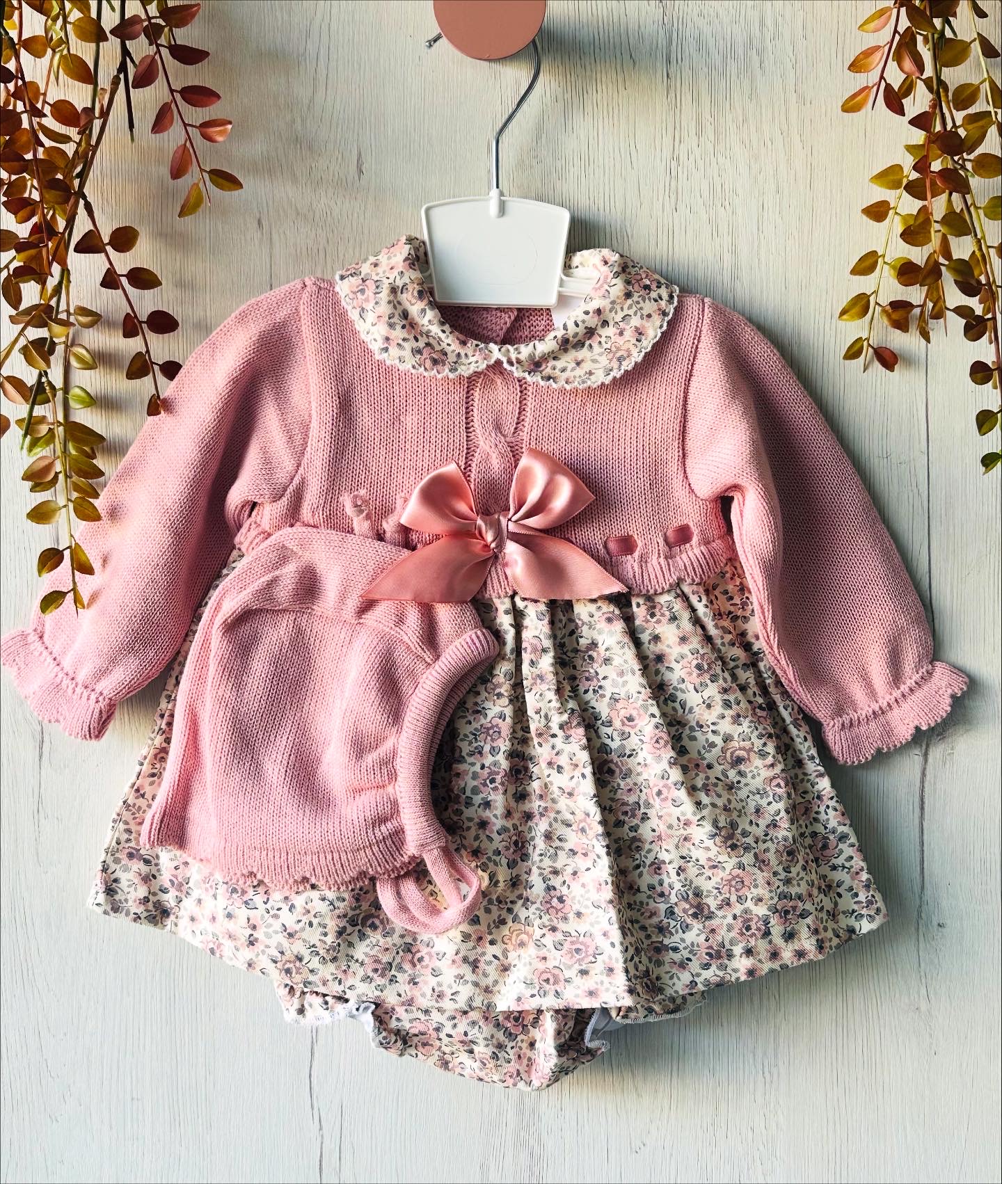 Vestido de punto rosa maquillaje y flores.